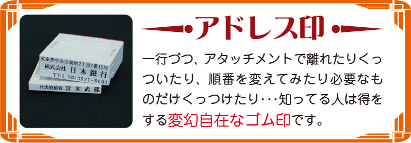 アドレス印は組み合わせて使用する上で全てのゴム印のゴム高がそろっていないと綺麗に捺印できません。